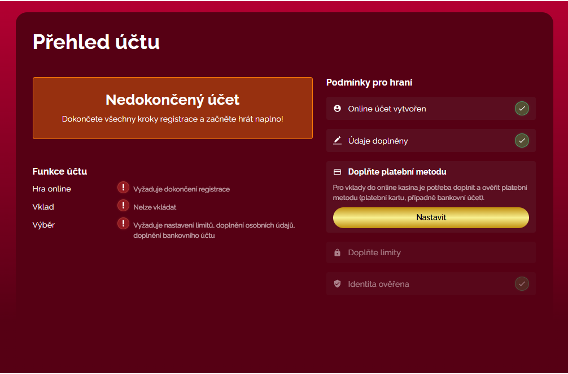 Nastavení herních limitů – musíte nastavit nebo odmítnout sebeomezující opatření v souladu se zákonem o hazardních hrách.