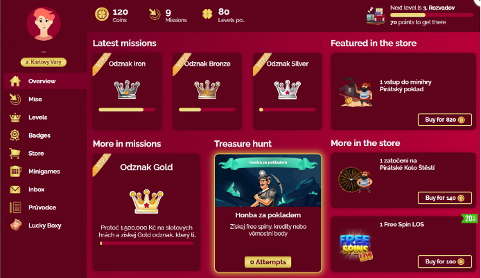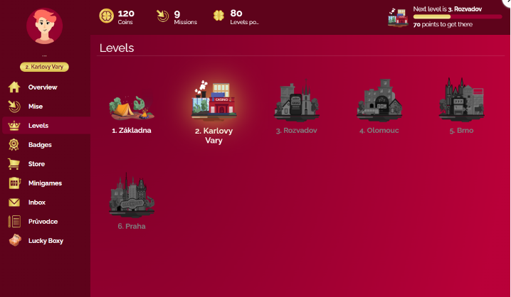 Levely (úrovně) – Postupujete českými městy od Základny přes Karlovy Vary, Rozvadov, Olomouc, Brno až do Prahy. Plníte mise, sbíráte body a získáváte přístup k exkluzivním bonusům a větším slevám.