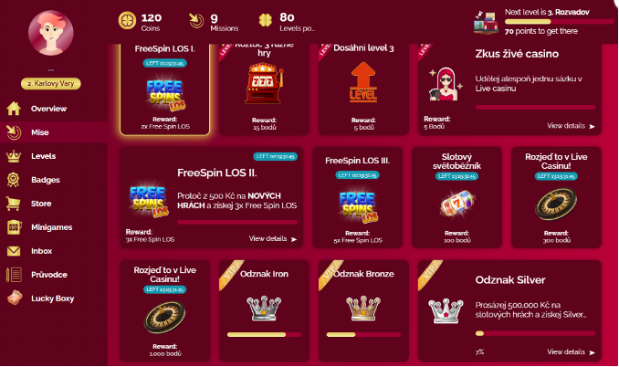 VIP odznaky – Automaticky získáváte odznaky podle protočených částek: Iron (50 000 Kč), Bronze (100 000 Kč), Silver (500 000 Kč), Gold (1 500 000 Kč) a Platinum (5 000 000 Kč).